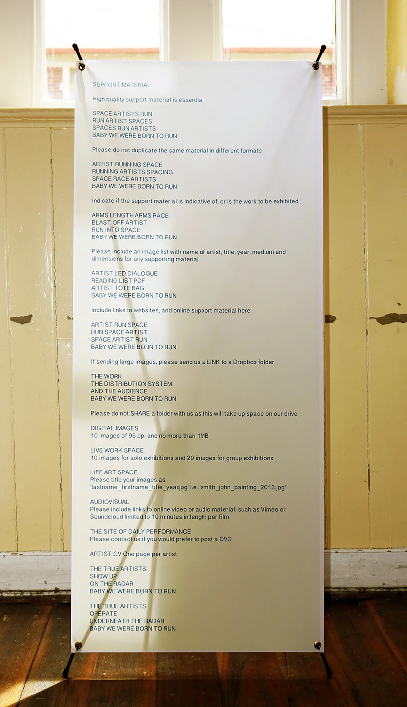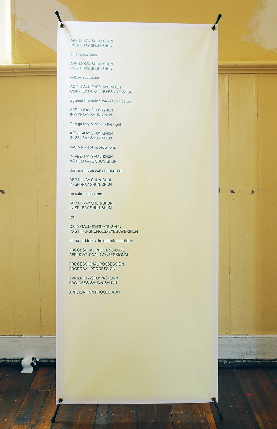 IN-SPI-RAY SHUN-SHUN APP-LI-KAY SHUN-SHUN is a text work and accompanying performance which weaves the language of open-call exhibition guidelines together with song lyrics and the artist's own writing, as well as quotations from the history of exhibition making and the legacies of artist's efforts to self-organise.